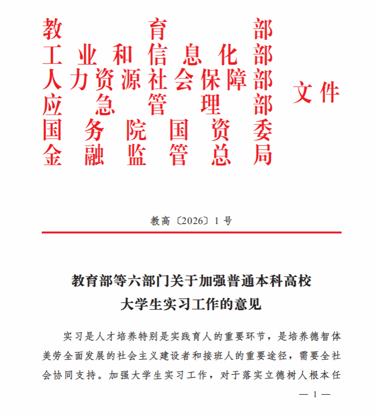 2026年2月27日,教育部为进一步提高实习质量,切实维护学生、学校和实习单位的合法权益,加强和规范普通本科高校实习管理工作,教育部发布《教育部等六部门关于加强普通本科高校大学生实习工作的意见》(教高[2026]1号)。请各单位组织广大教师,认真学习《意见》内容,并将其贯彻在本科生实习工作中。